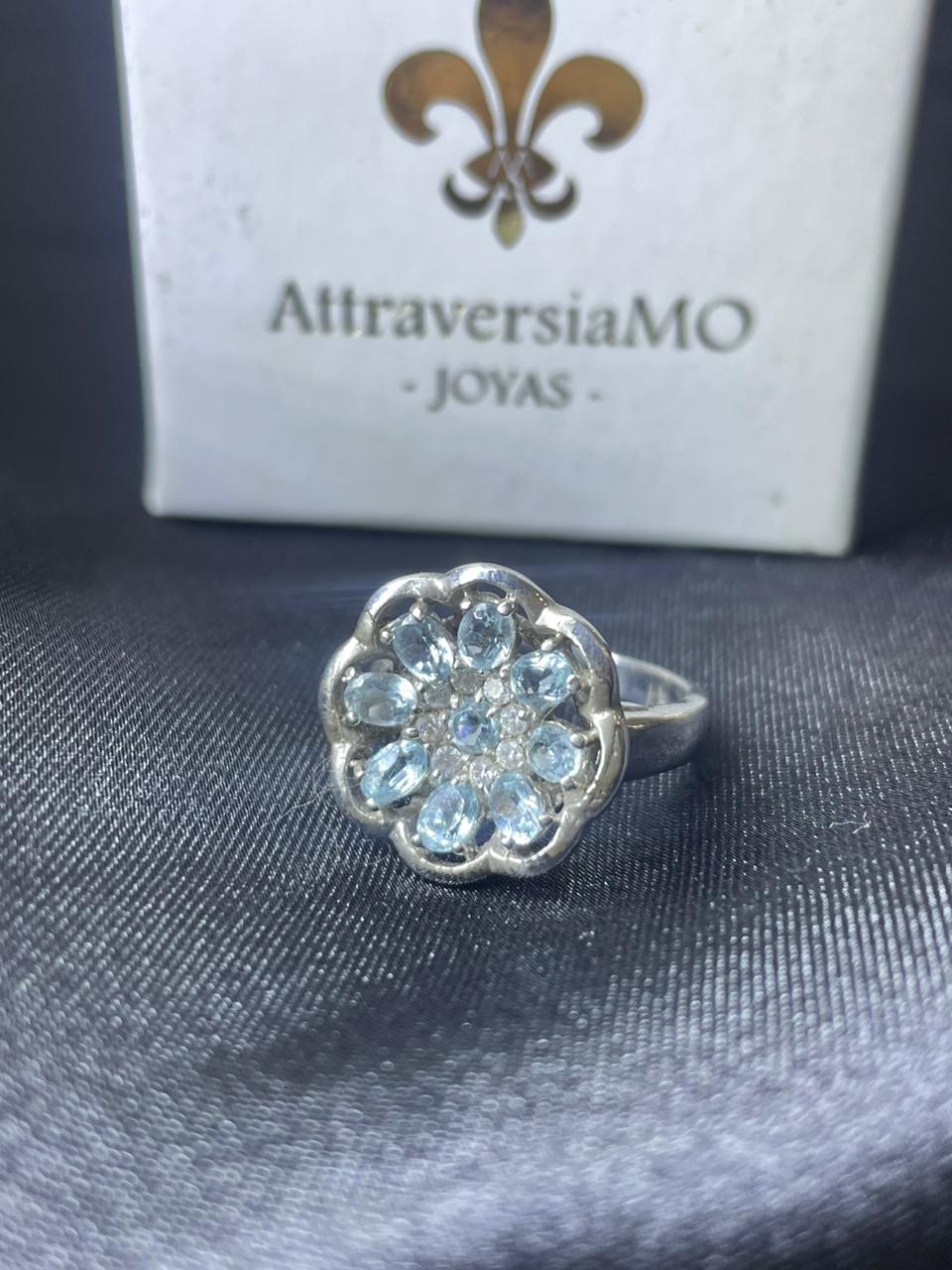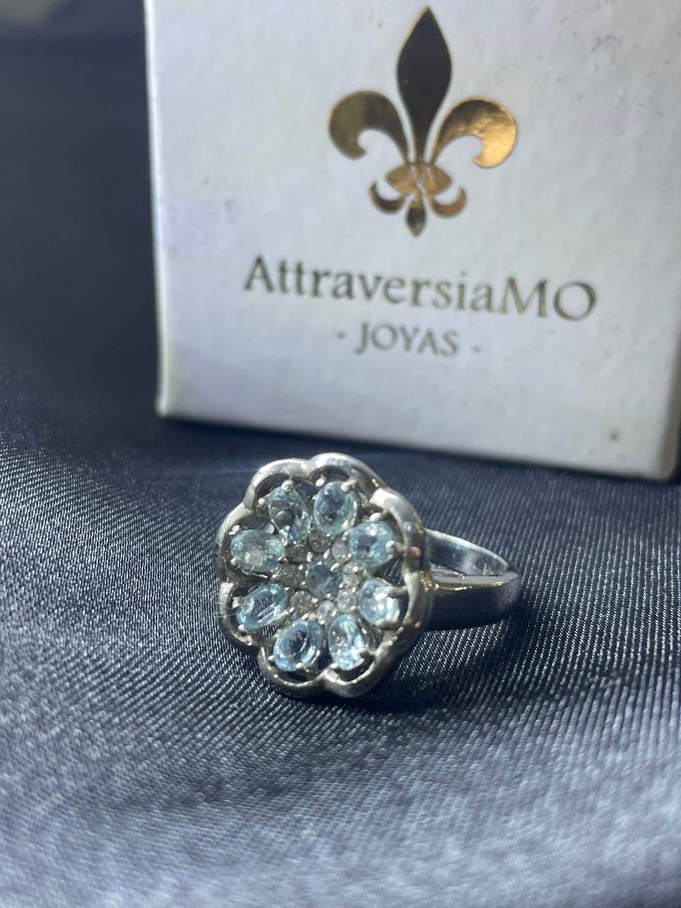 Anillo aguamarina con zircones blancos (forma de flor)